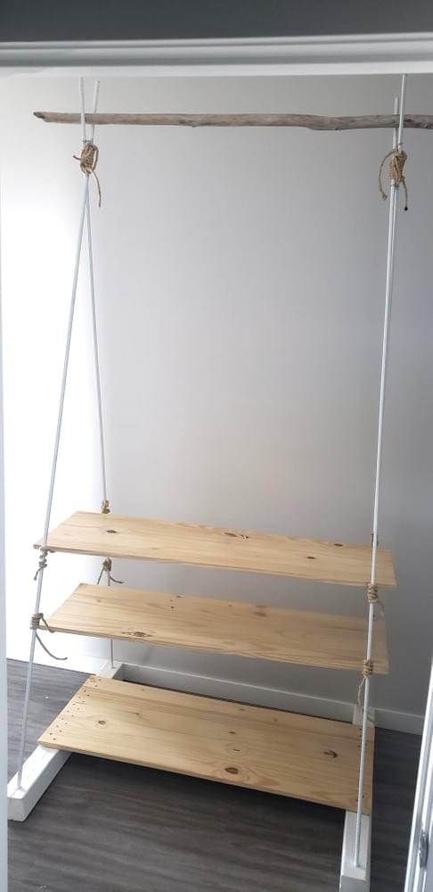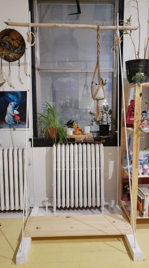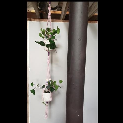 Items in this album include a piece generated in University as an exploration of matierals, a macrame purse, plant hangers, plant stand, and low profile fold up shelf.
